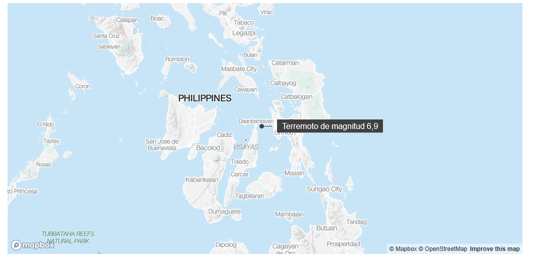 El fuerte terremoto se produjo alrededor de las 22:00 hora local, según el Servicio Geológico de Estados Unidos (USGS), a tan solo 10 kilómetros (6 millas) bajo el agua, justo al oeste de Palompon, Filipinas, y cerca de la ciudad de Bogo, en la provincia de Cebú.