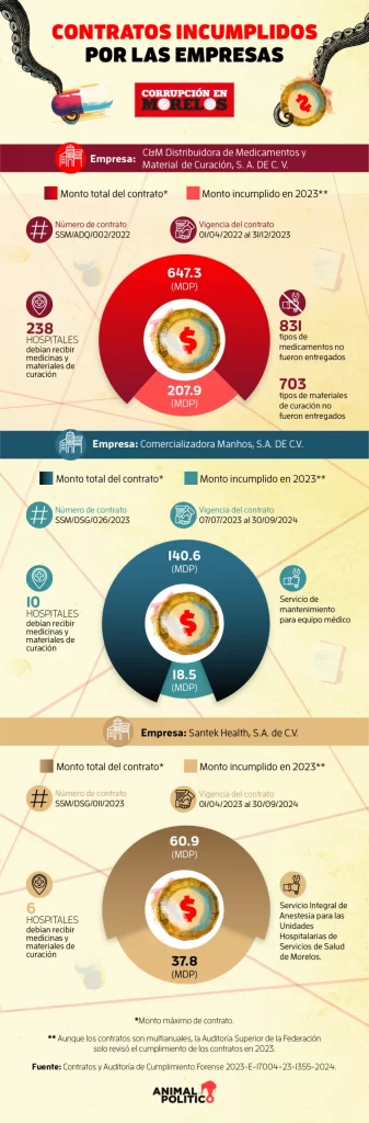 Un año después, la compañía recibió un segundo contrato similar. En febrero de 2025, la Auditoría exhibió que Servicios de Salud de Morelos no entregó pruebas de que se hubieran realizado los 11 mil servicios de anestesias pagados en dicho contrato.
