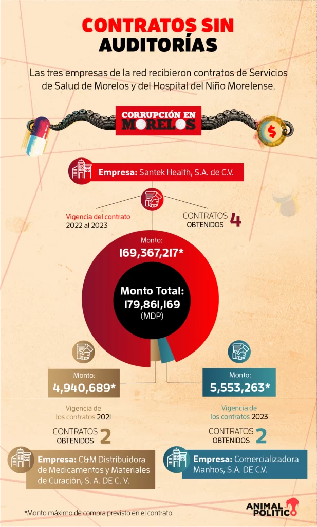 Animal Político confirmó que las empresas beneficiadas, Santek Health S.A. de C.V., Comercializadora Manhos S.A. de C.V. y C&M Distribuidora de Medicamentos y Material de Curación S.A., conforman una red en la que las mismas personas tienen cargos o acciones en ellas.