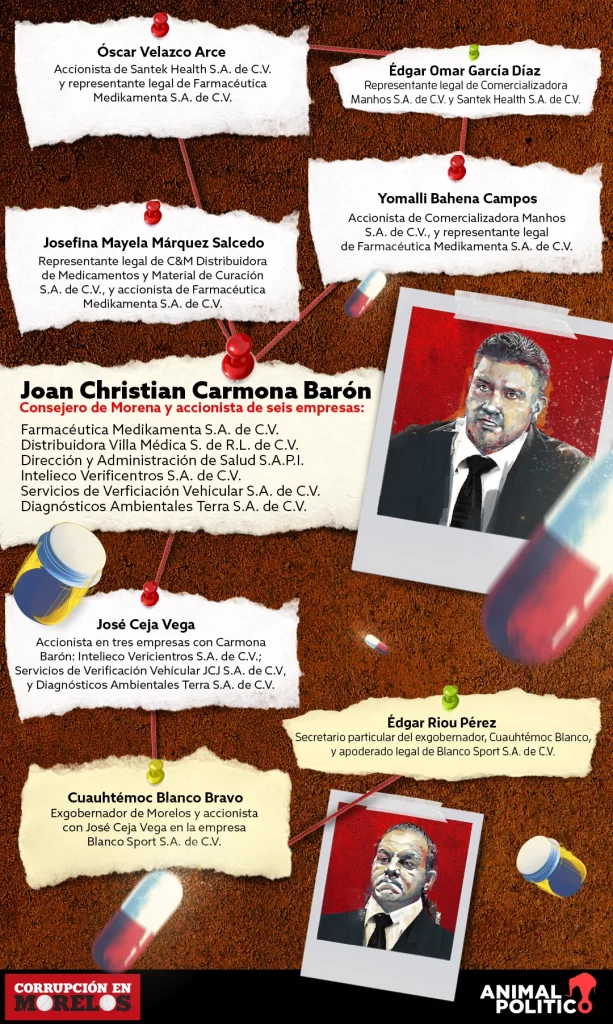 Además, tres de sus integrantes han sido accionistas y representantes legales de Farmacéutica Medikamenta S.A. de C.V., propiedad de Joan Christian Carmona Barón, precandidato a una diputación federal en 2023 por Morena, y quien como consejero pudo participar en la elaboración del proyecto político del partido en la entidad.