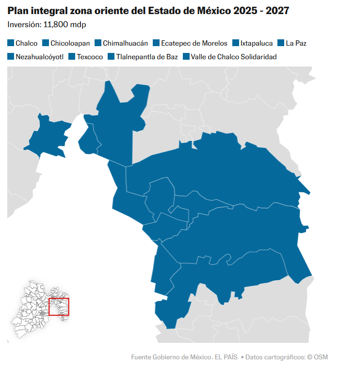 “Es una deuda, no solo del Gobierno, sino de todo México, porque en estas zonas se concentra la mayor pobreza urbana del país”, ha dicho Sheinbaum en su conferencia matutina, en la que ha convocado a los siete secretarios de las distintas carteras para que informen de las tareas que cada uno deberá desarrollar. En el Palacio Nacional han intervenido también la gobernadora del Estado de México, Delfina Gómez, y alguno de los alcaldes concernidos. Todo un despliegue para detallar uno de los proyectos más acuciantes y relevantes del sexenio, ha dicho la presidenta. Y no son pocos, la pobreza en México alcanza a más de 46 millones de personas, muchas de ellas en el mundo rural, afectadas por el hambre y parecidas carencias a las que presentan las periferias urbanas. El esfuerzo presupuestario de esta iniciativa saldrá en un 60% del Gobierno federal, un 30% del gobierno estatal y un 10% de los Ayuntamientos.