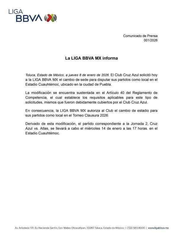 La Federación Mexicana de Futbol (FMF) dio a conocer la decisión a través de un comunicado oficial, en el que se detalla que el Club Cruz Azul solicitó formalmente a la Liga BBVA MX el cambio de sede para disputar sus encuentros como local en el inmueble poblano.
