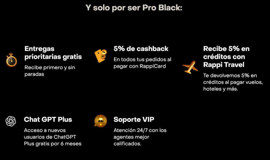 Esto es posible con la suscripción Rappi Pro Black, que además de los envíos ilimitados y la eliminación de la tarifa de servicio en restaurantes cercanos, ofrece acceso a descuentos, «sorpresas exclusivas» con Rappi Turbo, rebajas en tiendas, entregas prioritarias gratis, 5% de cashback con RappiCard y, por supuesto, el acceso a ChatGPT Plus.