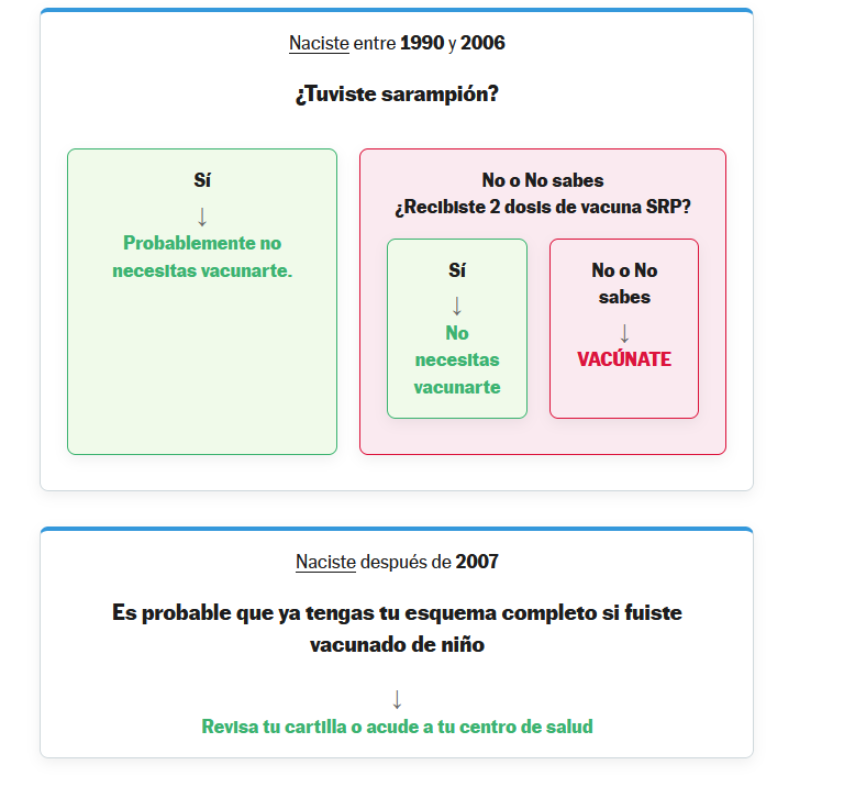 En México, el esquema de vacunación vigente contempla dos dosis de la vacuna triple viral SRP (sarampión, rubéola y paperas) para todos los menores de 10 años.